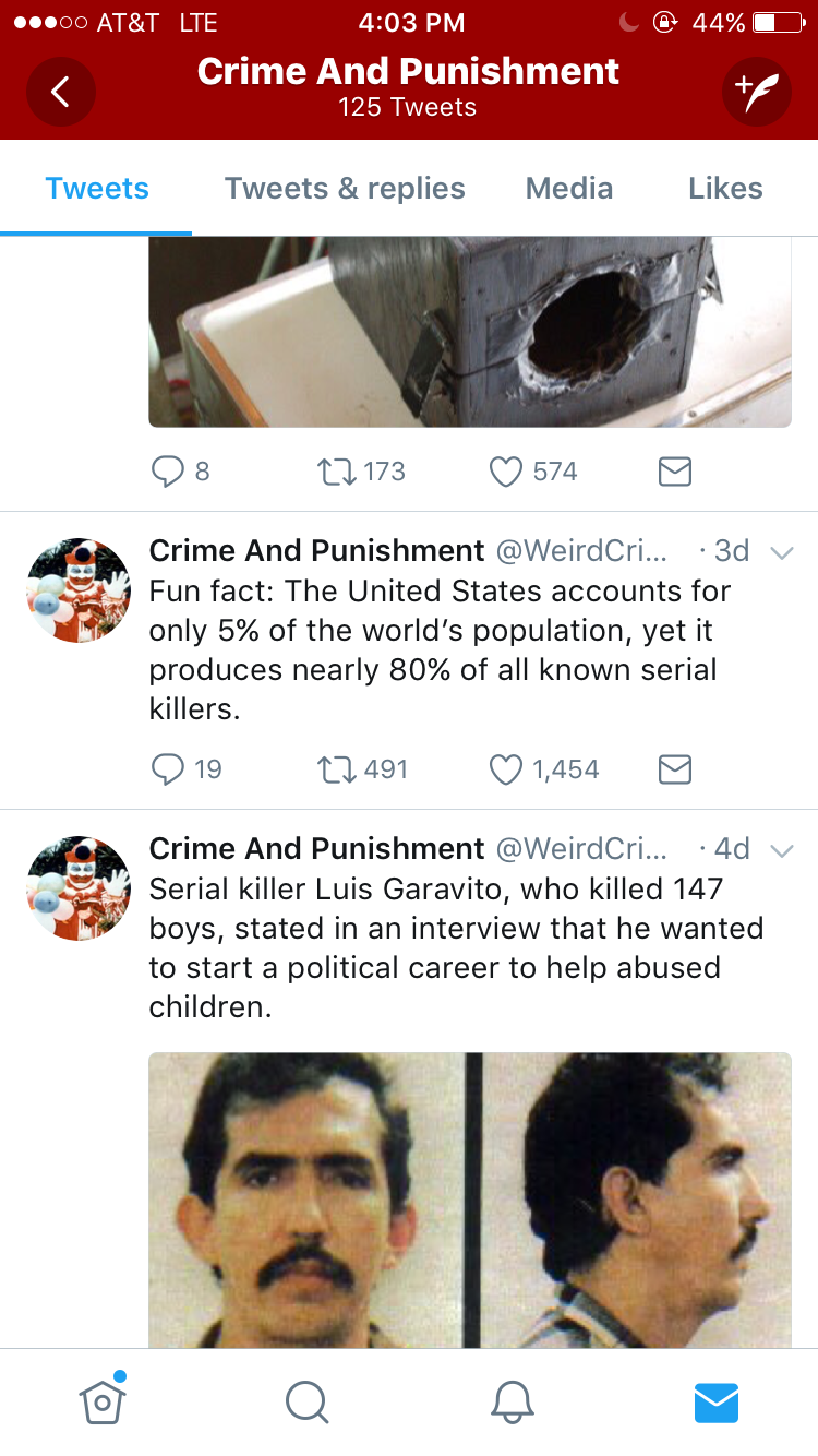 If you’re like me and love shows like Criminal Minds, follow @WeirdCrimeFacts to see some interesting chilling pictures and facts about murders and other serious crimes.
