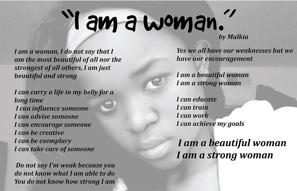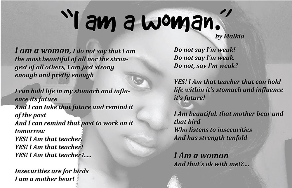 Empowerment Malkia’s Creativity! October 21, 2017 emmawp written by Emma Bartley Malkia, a refugee and poet (read about her story here!), has expressed her creativity this month through her poetry. Here are two different versions of her poem, “I am a woman.” You can also read more of her poetry here! How will you express your creativity this month?